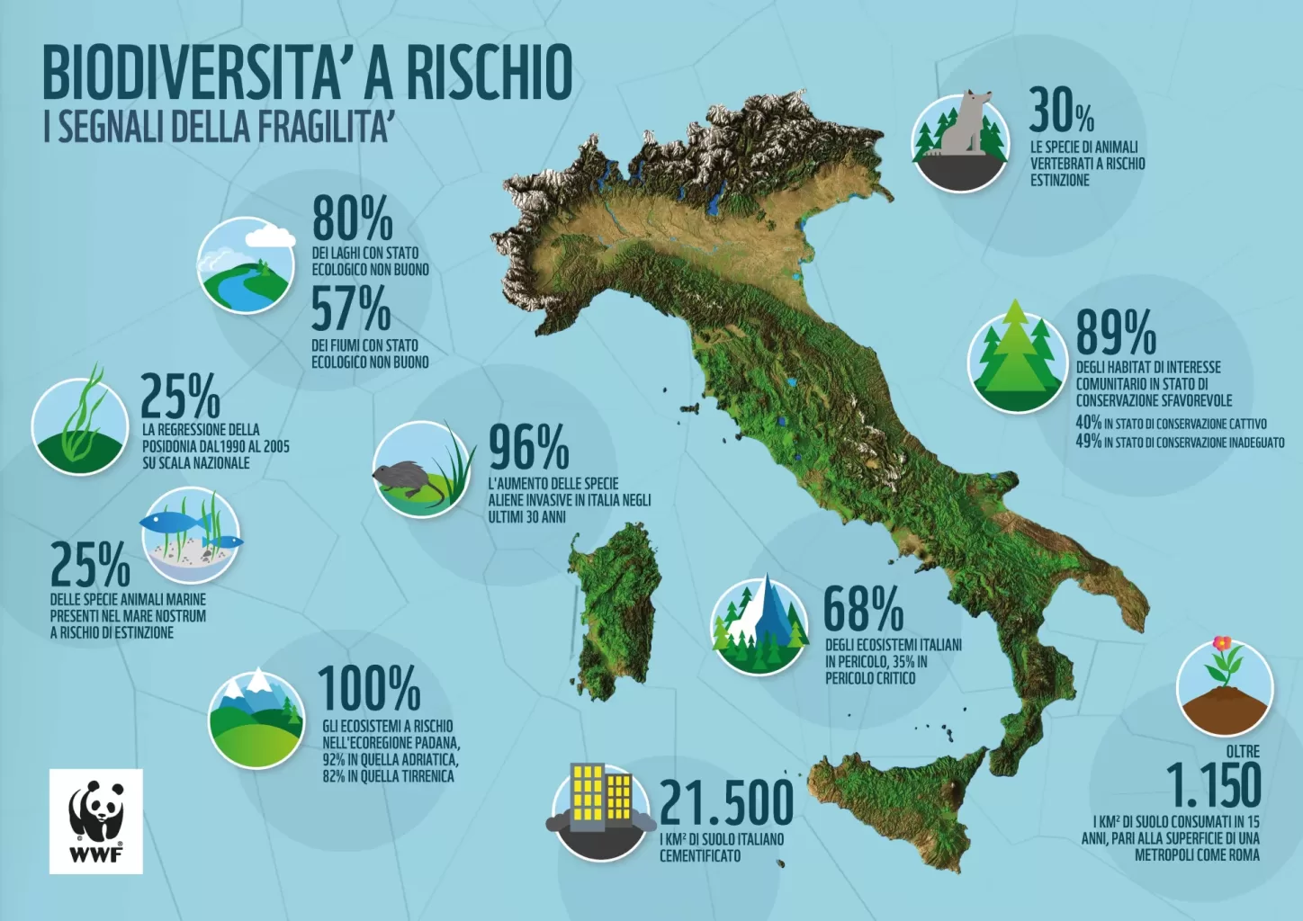 Questa crisi di natura è evidente anche in Italia, dove la biodiversità raggiunge valori elevatissimi (contiamo metà delle specie vegetali e circa 1/3 di tutte le specie animali presenti in Europa), ma che con cieca determinazione stiamo erodendo e distruggendo, mettendo a rischio la nostra stessa sicurezza e il nostro benessere.